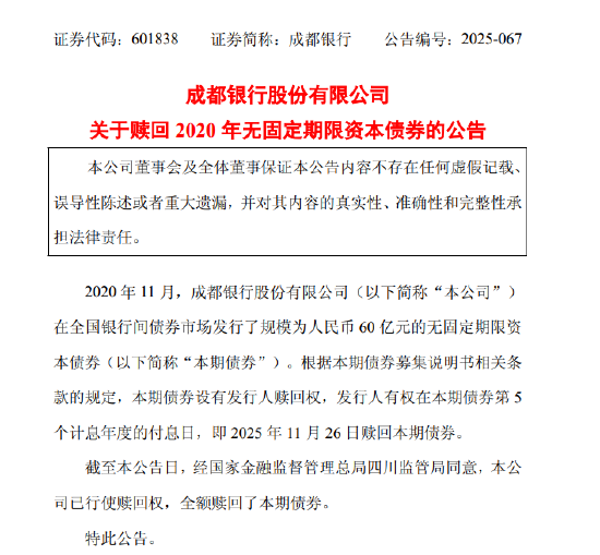 根据招股说明书相关条款,公司有权于本期债券第五个计息年度的付息日,即2025年11月26日赎回本期债券。截至公告日,公司经国家金融监督管理局四川监管局同意,行使赎回权,全额赎回现有本期债券。